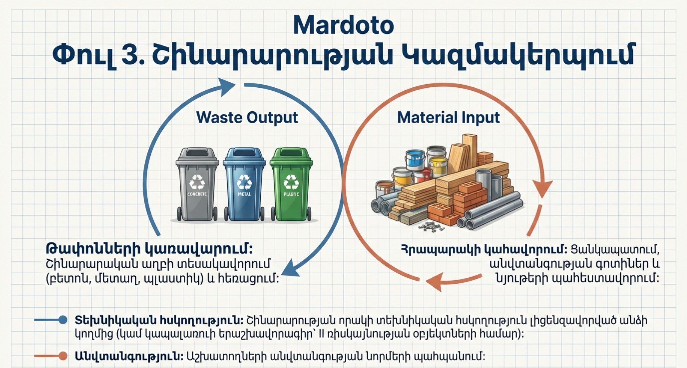 Թափոնների կառավարում՝ շինարարական աղբի տեսակավորում (բետոն, մետաղ, պլաստիկ) և հեռացում: