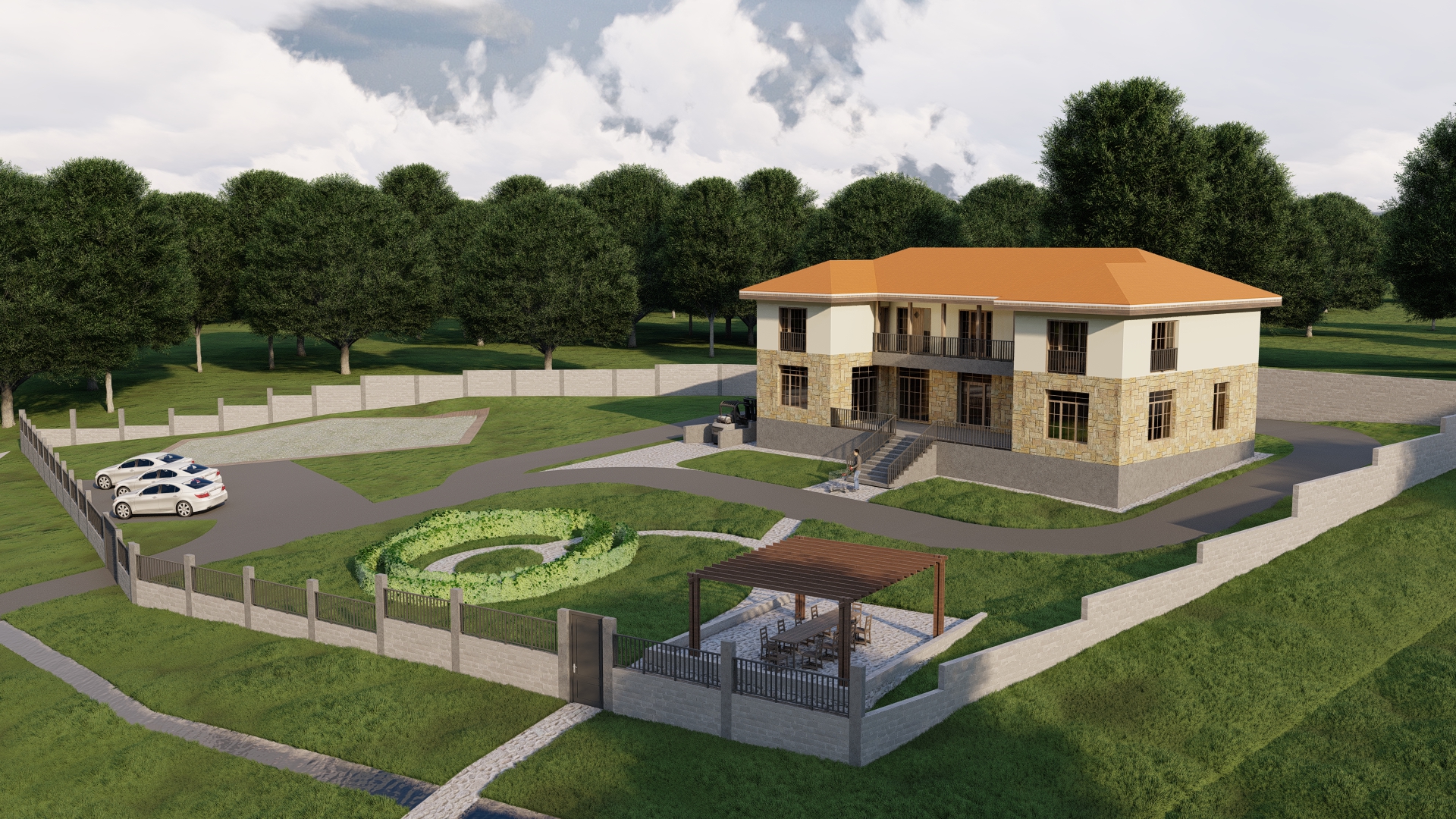 Տանիք: Բազմալանջ տանիքը ծածկված է փափուկ կղմինդրով, ինչը շենքին հաղորդում է ջերմ և բնական տեսք: