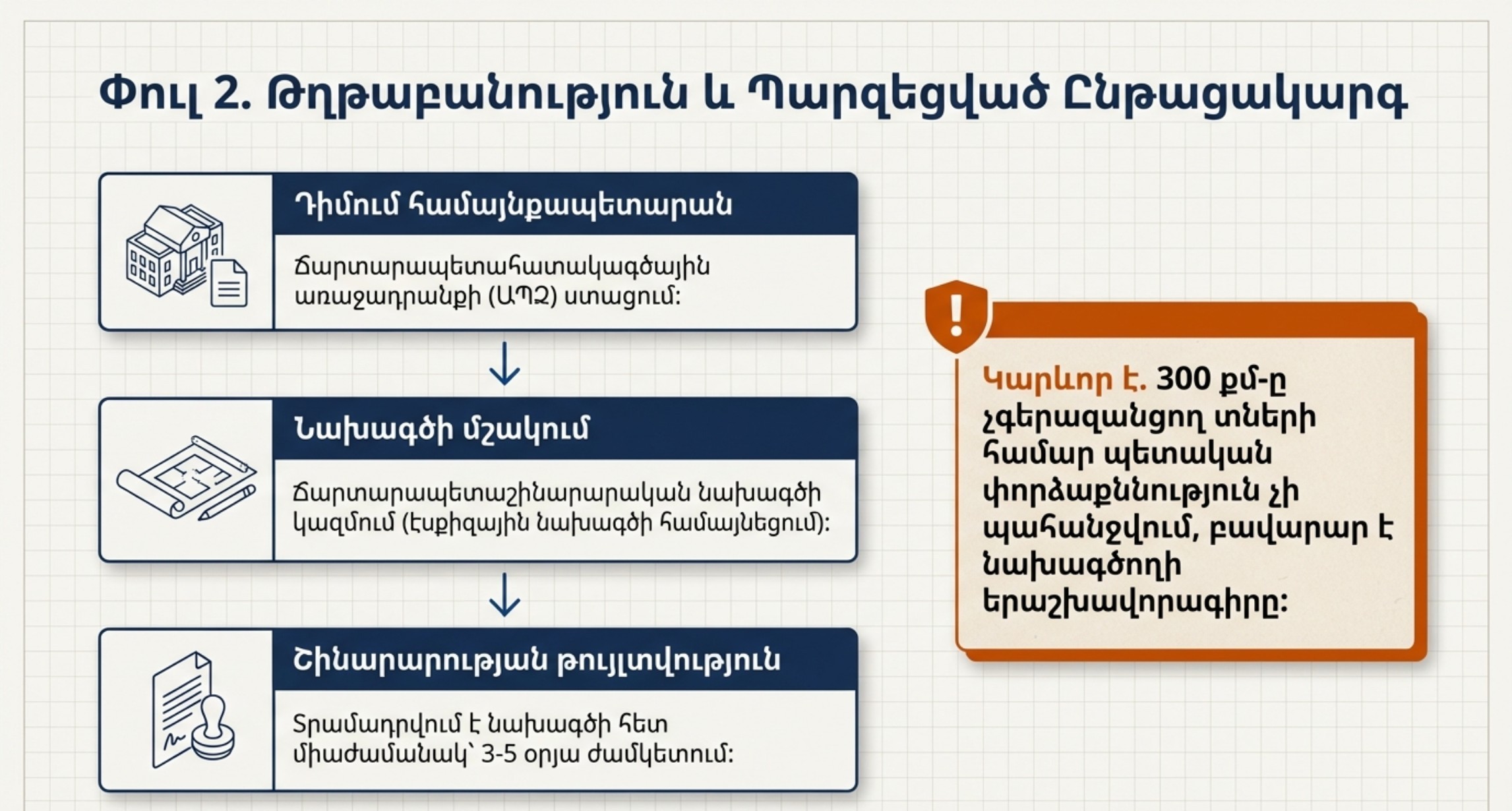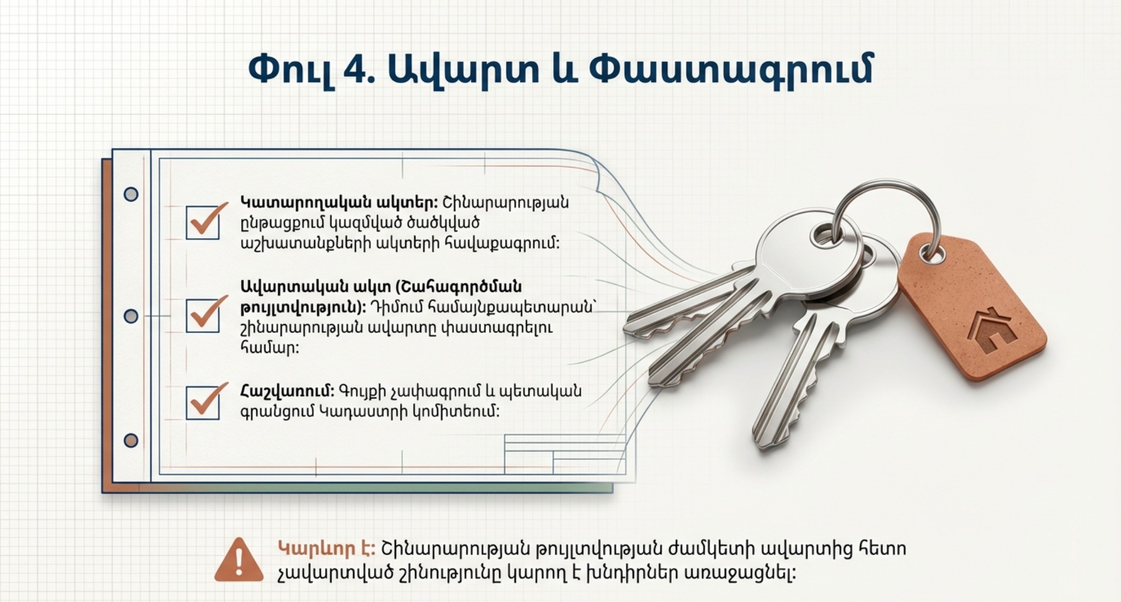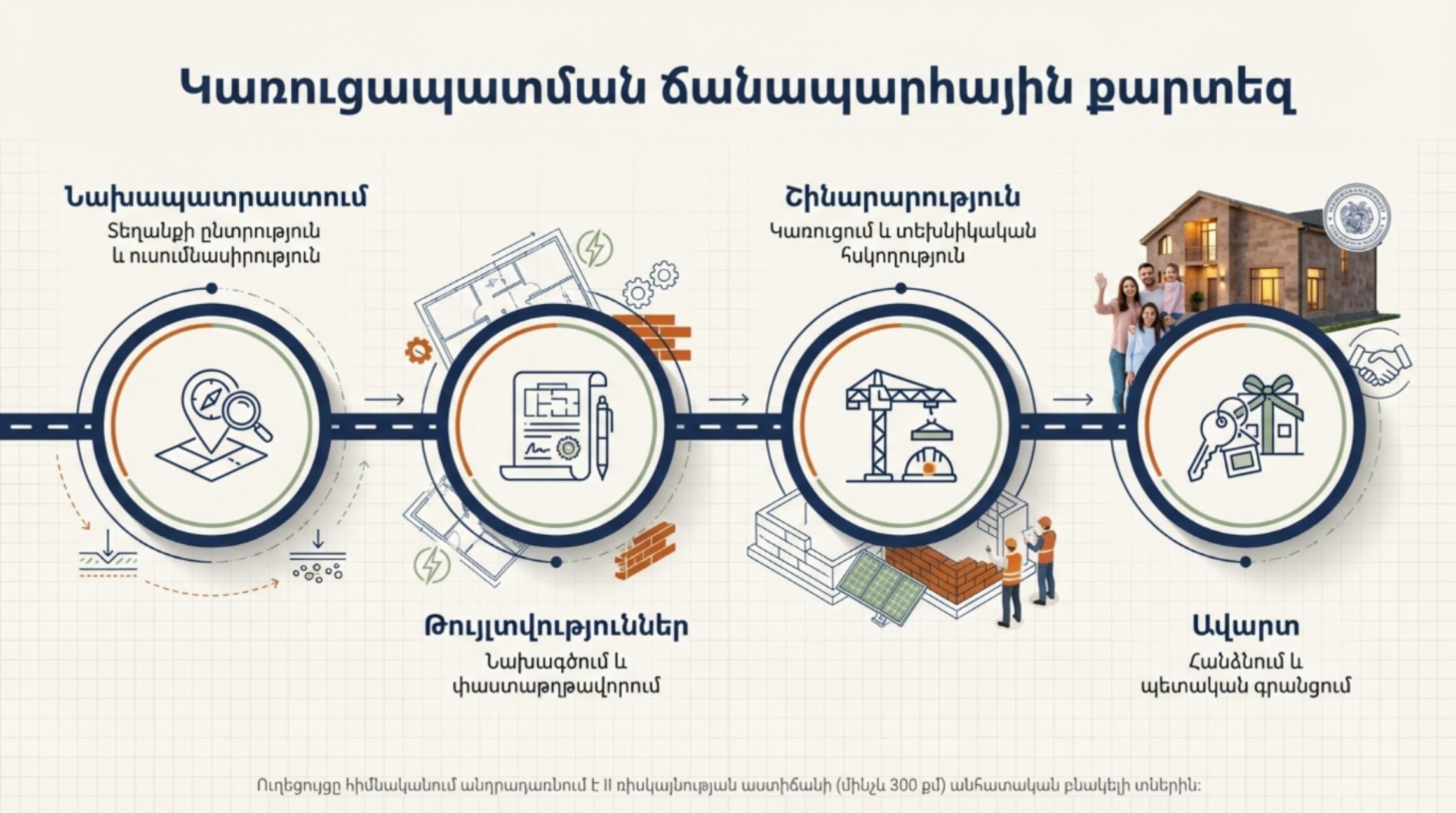 Steps required to build an individual residential house up to 300 sqm (Risk Category II) in Armenia:1. Preparation and Site Study Mandatory engineering-geological study to determine the foundation type (based on the seismic zoning map).For sloping terrains, providing retaining walls and drainage systems.Orienting the long facades of the house to the south to maximize the use of solar heat in winter.2. Design and Documentation (Simplified Procedure) Applying to the municipality to obtain an Architectural-Planning Assignment (APZ).Drafting the architectural-construction project.For houses not exceeding 300 sqm, state expertise is not required; the designer's warranty is sufficient.The construction permit is issued simultaneously with the project within a 3-5 day period.3. Construction Organization Site setup: fencing, safety zones, and material storage.Technical supervision of construction quality by a licensed person (or contractor's warranty for Category II risk objects).Maintaining worker safety norms and mandatory installation of fire alarm systems and smoke detectors.Waste management: sorting construction debris (concrete, metal, plastic) and disposal.4. Completion and Documentation Collecting executive acts for hidden works compiled during the construction process.Applying to the municipality to document the completion of construction and obtain a completion act (occupancy permit). Unfinished construction after the permit expiration date can cause issues.Property measurement and state registration at the Cadastre Committee.