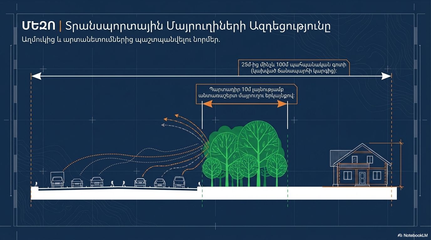 • Transport Highways: To protect against noise, a buffer zone of 25m to 100m is established. A mandatory 10m wide forest strip along the highway is also required.