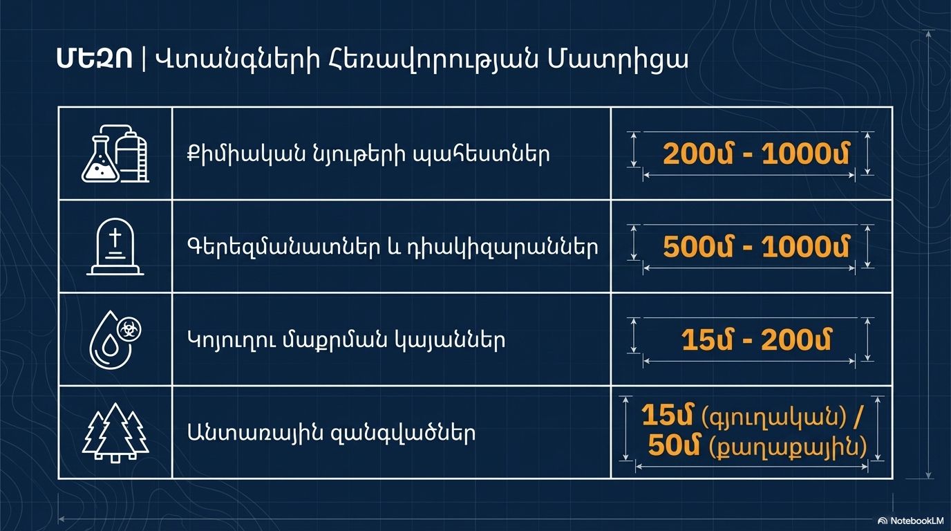 • Sanitary Protection Zones: A distance requirement of up to 1000 meters applies to chemical storage facilities, cemeteries, and crematoriums.
