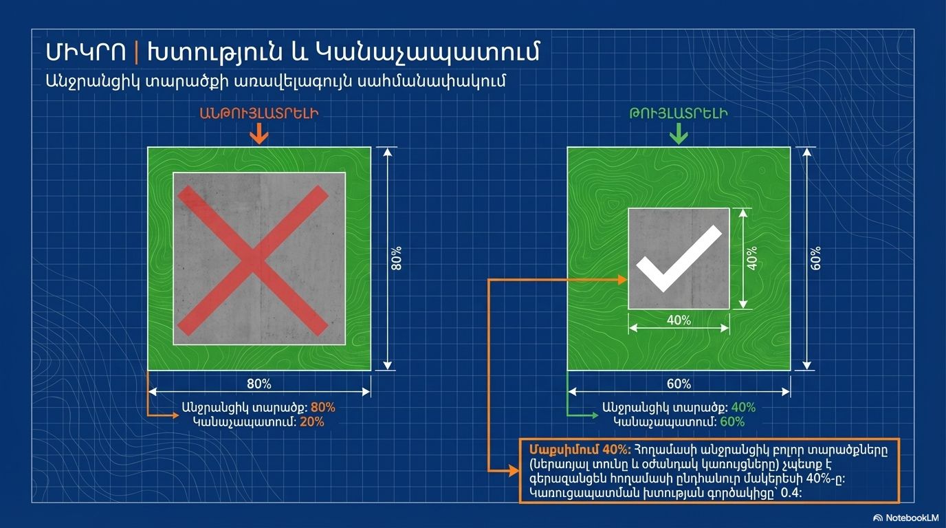 • Density and Landscaping: All impermeable areas of the plot must not exceed 40% of the total area. The remaining 60% must be landscaped.