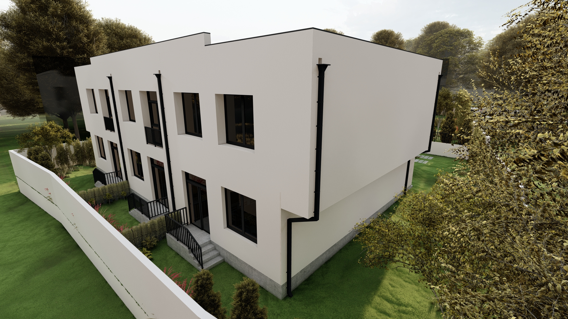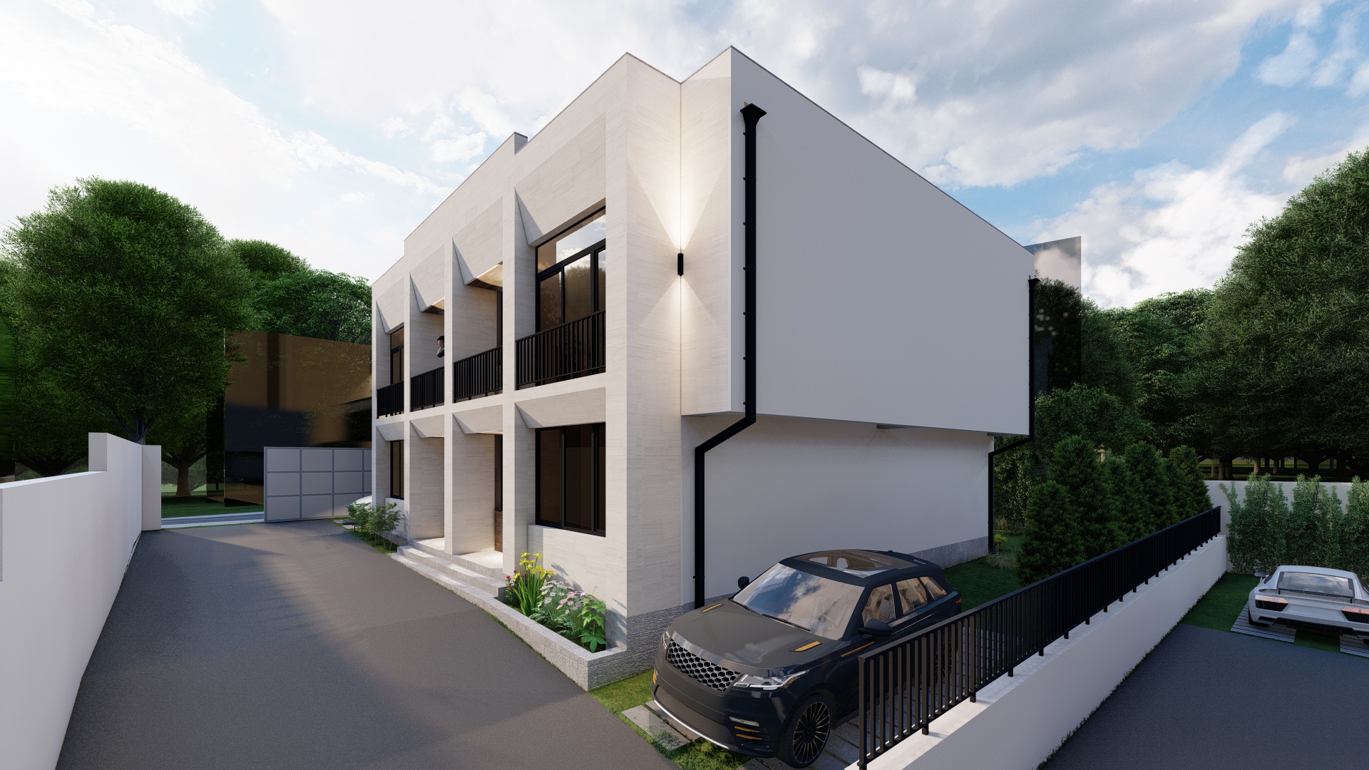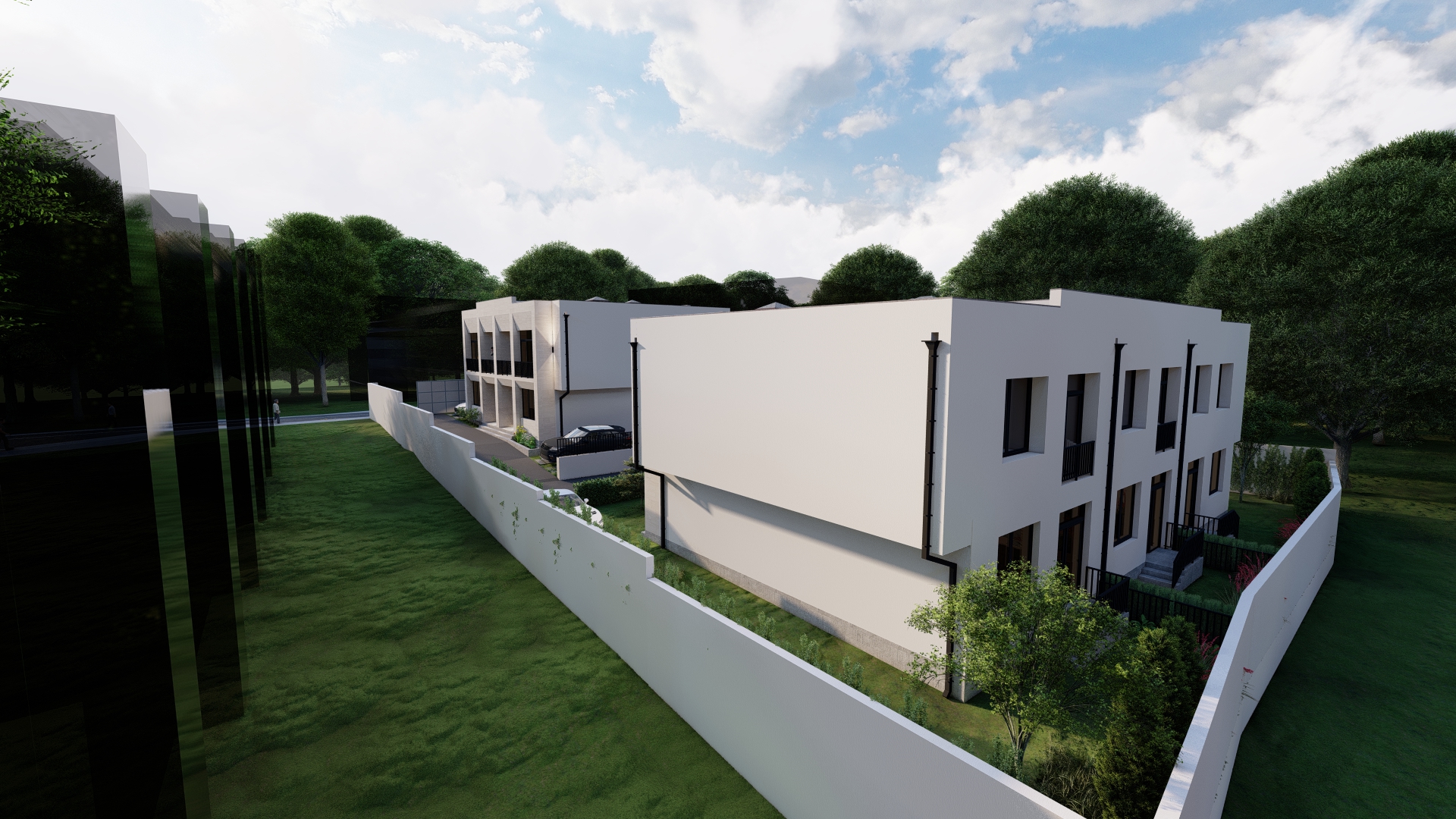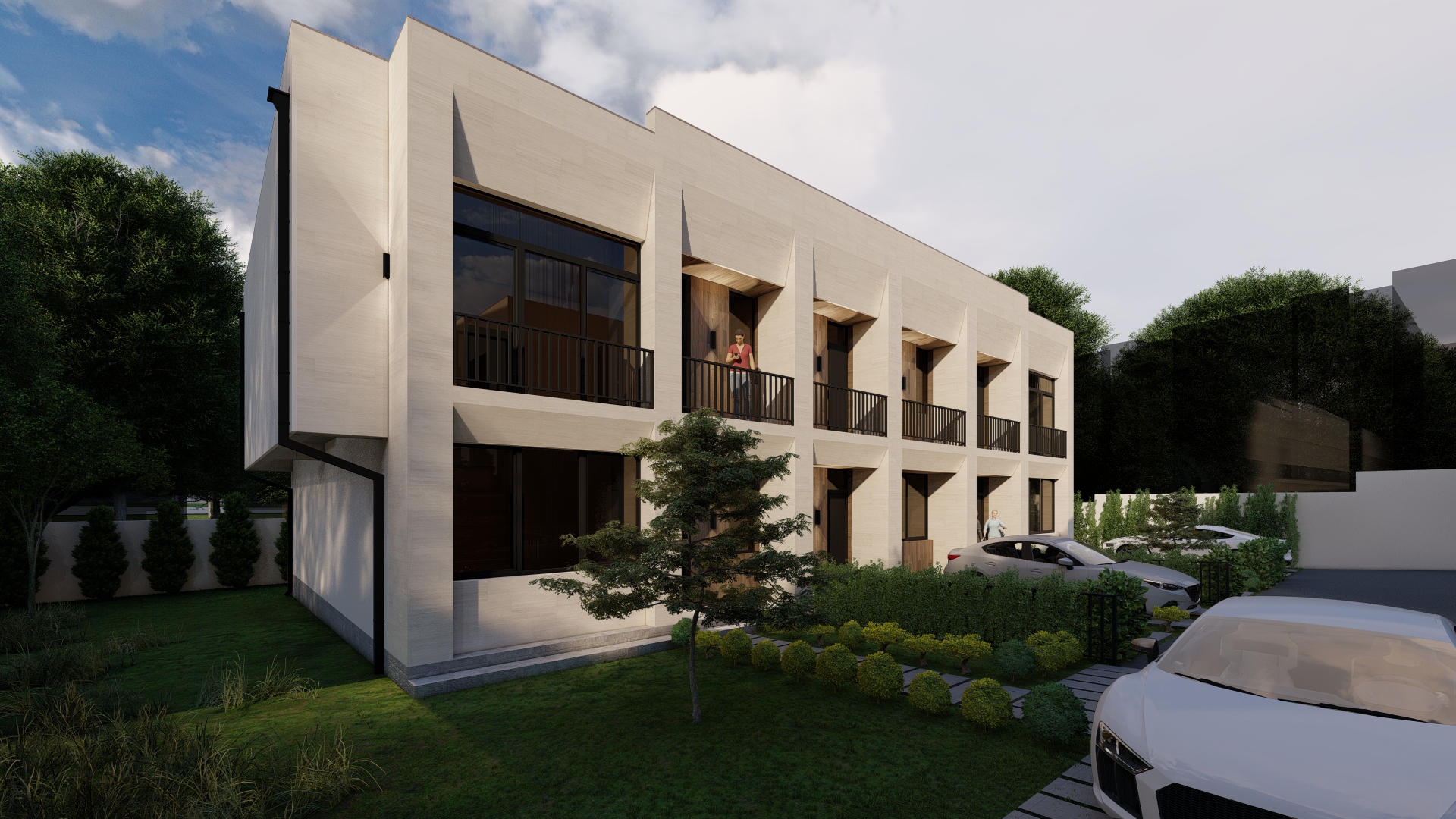 A modern complex of row houses (townhouses) has been designed in the Kasakh community of the Kotayk region. Set on a 0.122-hectare plot with a slight slope, the project includes two residential blocks consisting of 5 private houses in total, each featuring a landscaped yard and individual entrances.