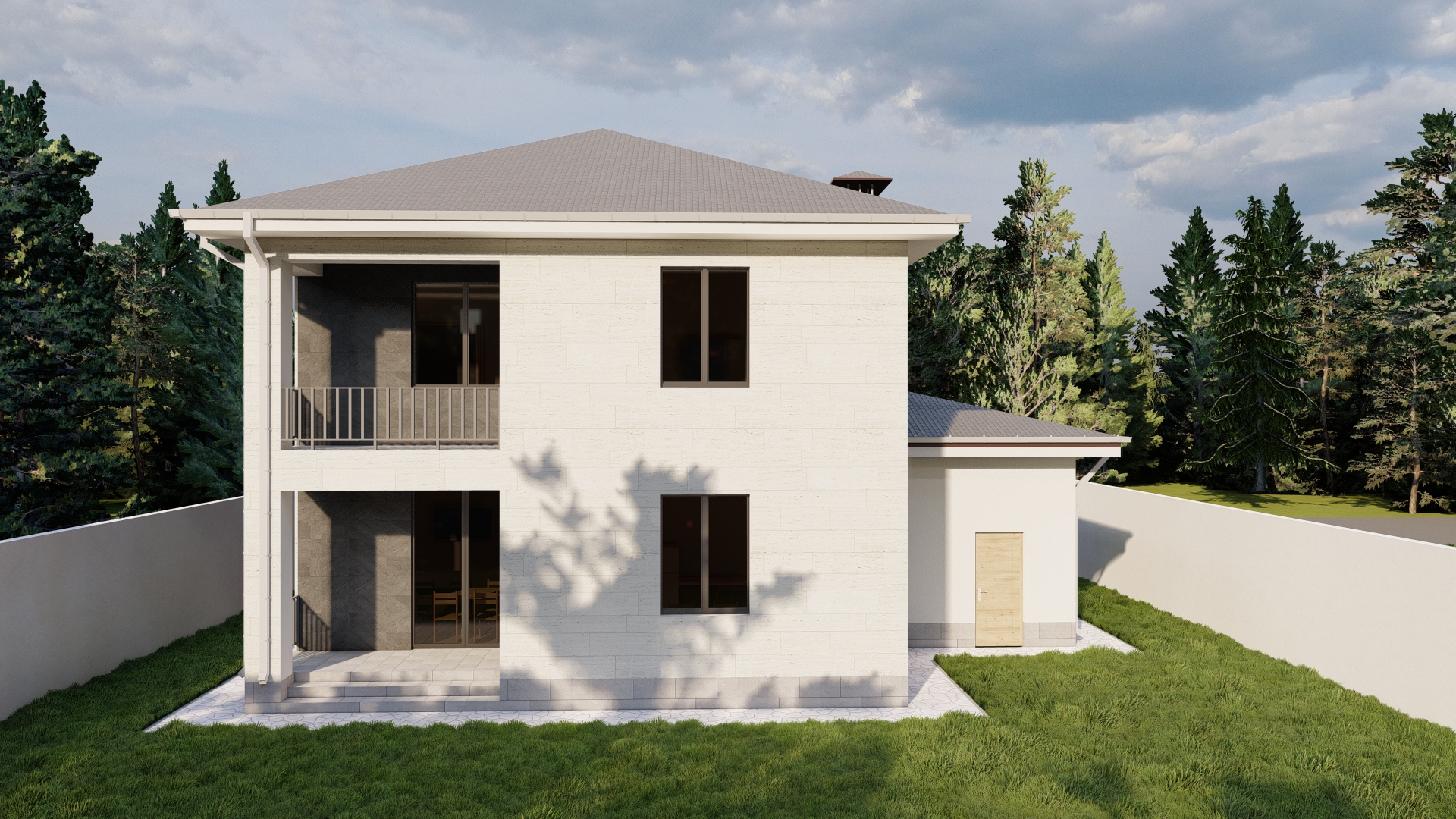 Մակերեսներ: Բնակելի տան հարկերի ընդհանուր մակերեսն արտաքին եզրագծով կազմում է 265.13 քմ: Կառուցապատման ընդհանուր մակերեսը (ներառյալ ավտոտնակը) կազմում է 147.74 քմ: